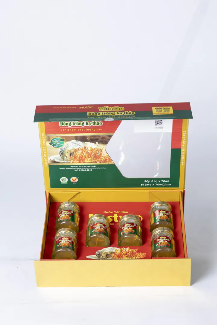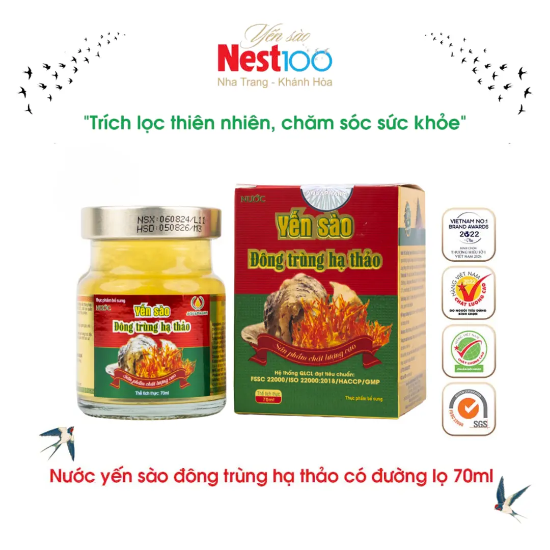 Nước, yến sào đã chế biến (10-35%), đông trùng hạ thảo sấy thăng hoa (2500mg/L), đường phèn, chất làm dày (401, 415, 406, 327), chất bảo quản (211), màu tổng hợp (102, 110), hương tổng hợp dùng cho thực phẩm.