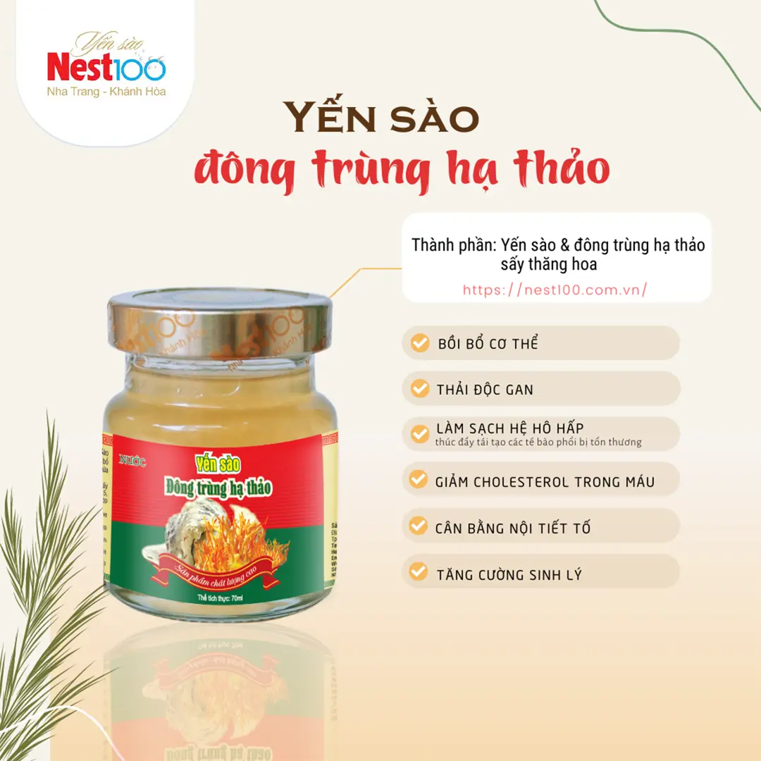Nước, yến sào đã chế biến (10-35%), đông trùng hạ thảo sấy thăng hoa (2500mg/L), đường phèn, chất làm dày (401, 415, 406, 327), chất bảo quản (211), màu tổng hợp (102, 110), hương tổng hợp dùng cho thực phẩm.