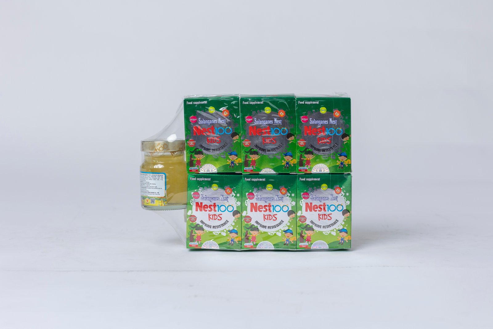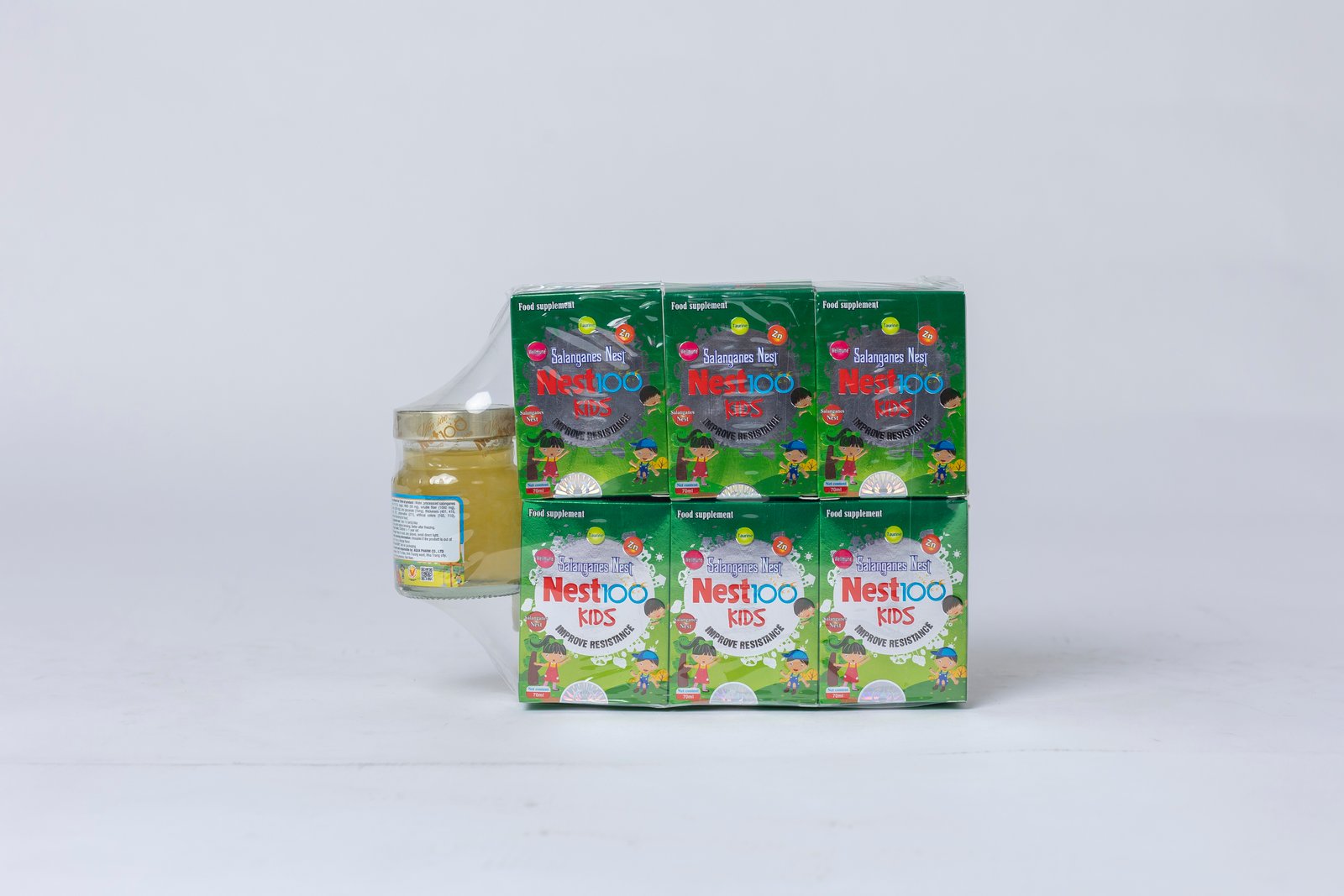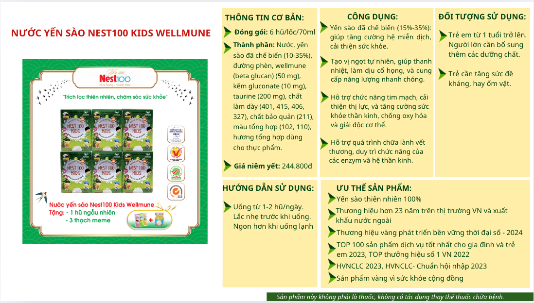 Nước, yến sào đã chế biến (10%), đường phèn, lysine (500mg), wellmune (50mg), taurine (200mg), calcium lactate (30mg), kẽm gluconate (20mg), chất làm dày (401, 415, 406, 327), chất bảo quản (211), màu tổng hợp (102, 110), hương tổng hợp dùng cho thực phẩm.